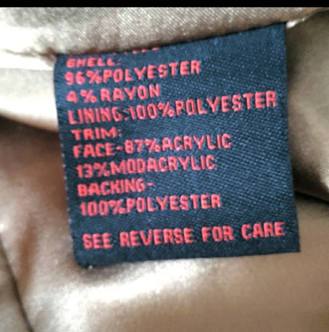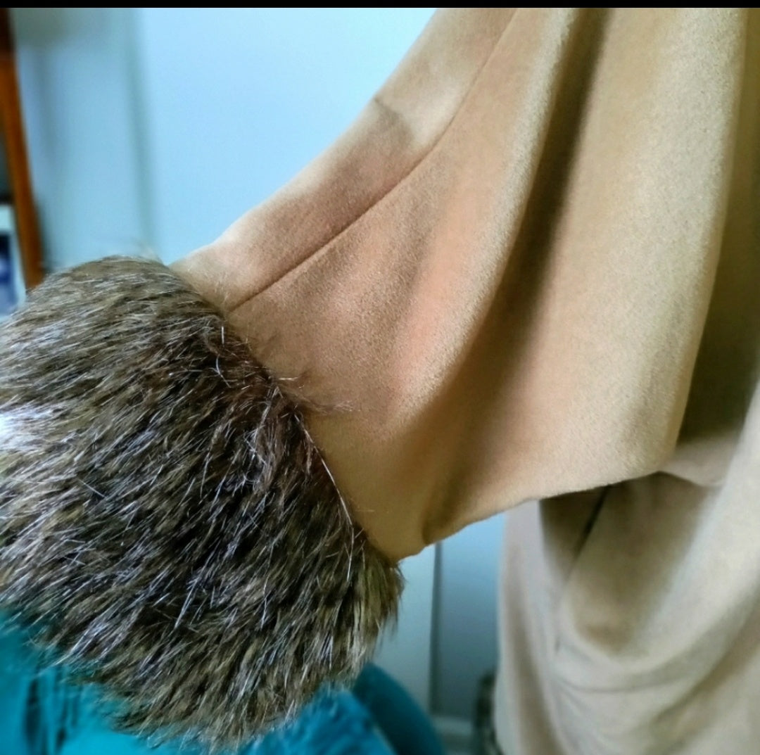 Faux Fur long sleeves trench length with faux fur trim on front and the Hem of coat and on the sleeves cuff. Has a pocket on each Side. 100% polyester. In excellent condition.