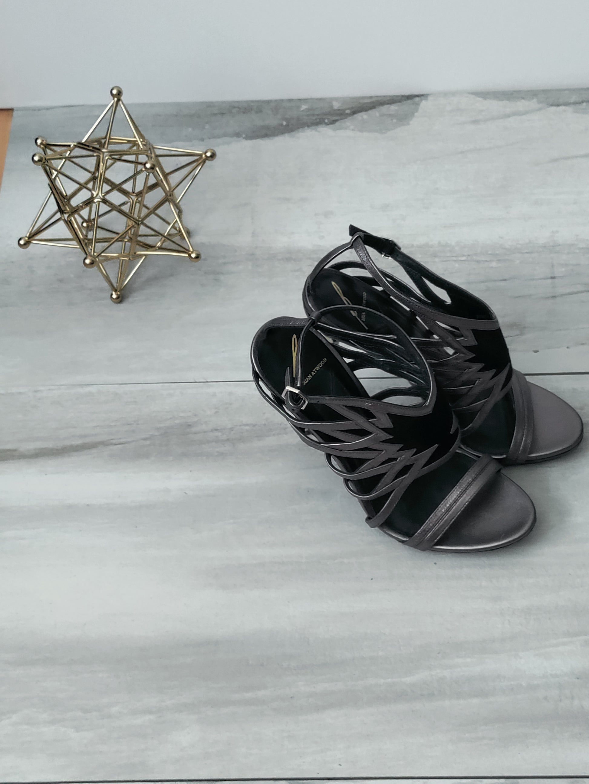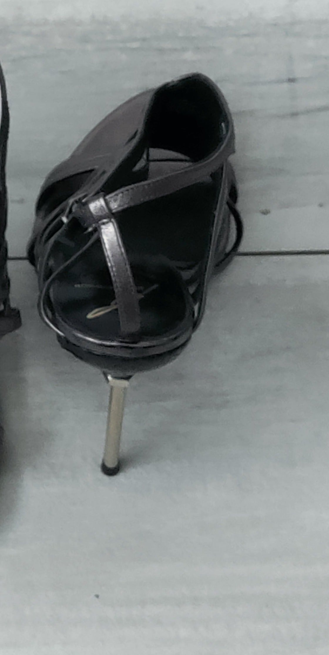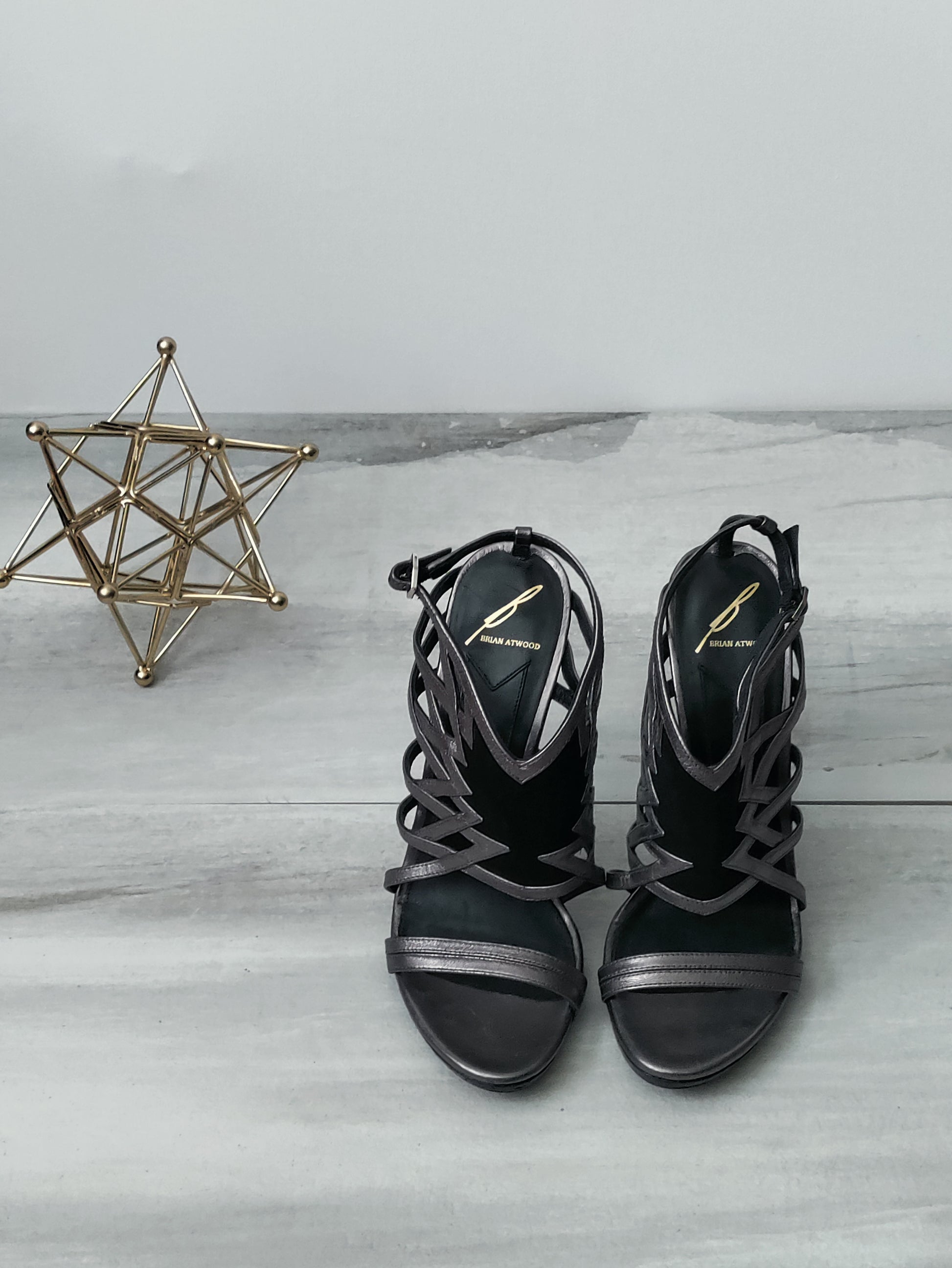 Brian Atwood ankle strap open toe, gold metal stiletto heels. In great condition.