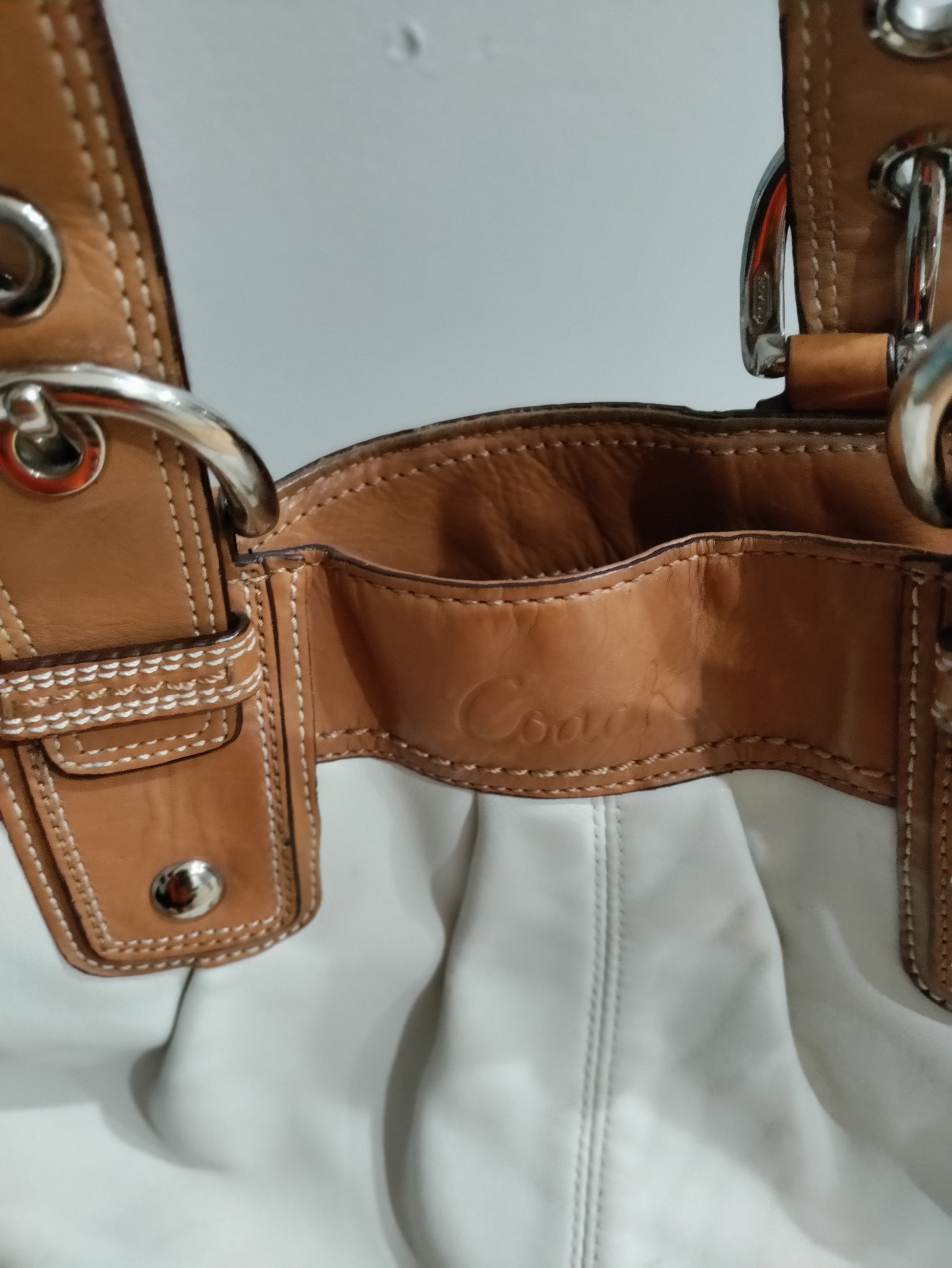 Cream color coach shoulder handbag with brown straps silver buckle on straps has gold tone feet on bottom of bag overall the handbag is in great condition