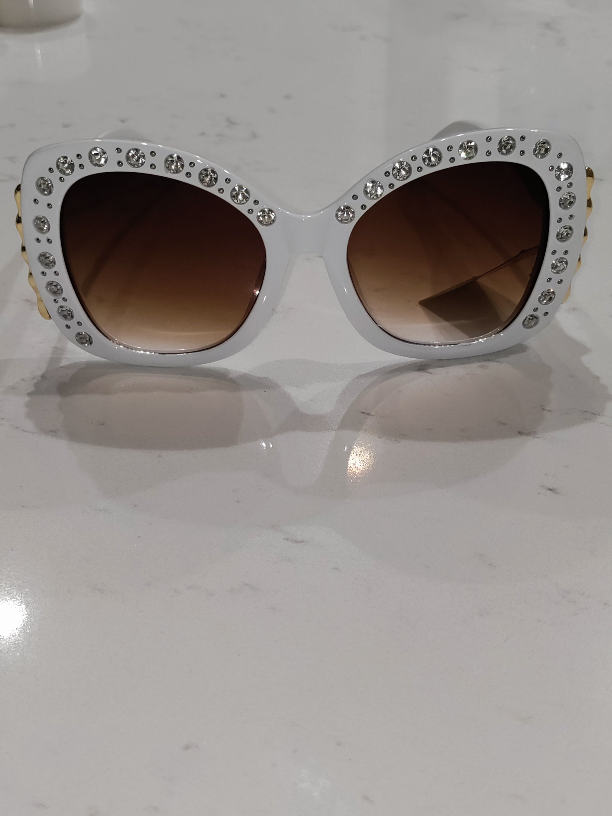 Elton John inspired frames with clear rhinestones around the lens frame and a gold trim on the side of each frame with tinted lens brand new never been worn