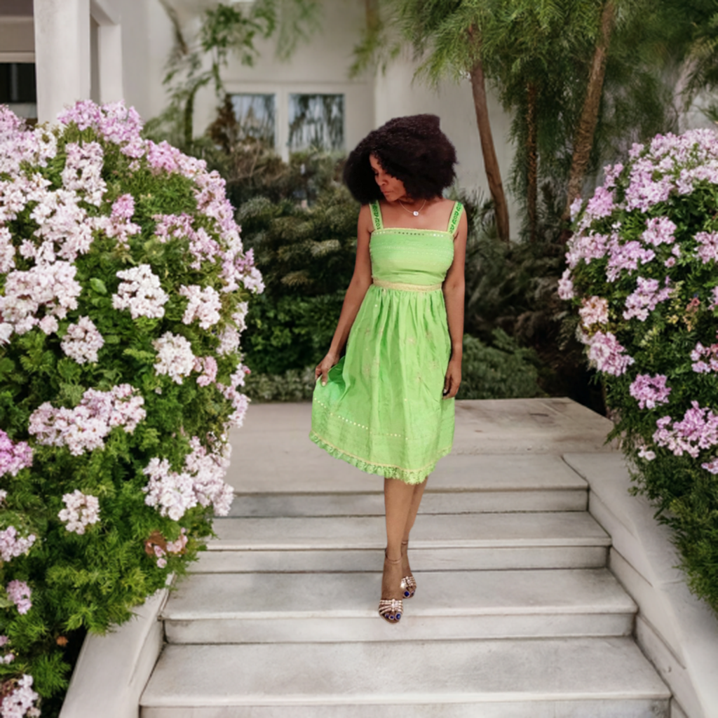 Color Lime Green has a square neckline with gold waist trimming and the bottom of dress.