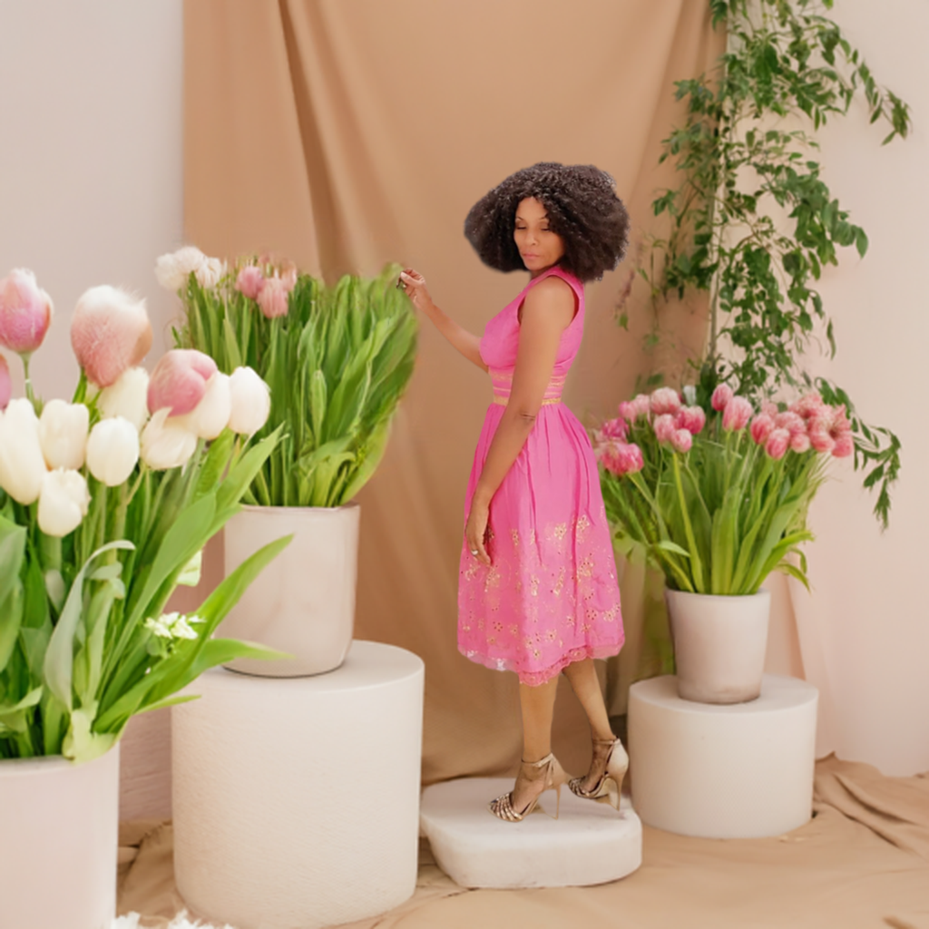 Color Pink has v-neckline and gold trimming on waist and bottom of dress