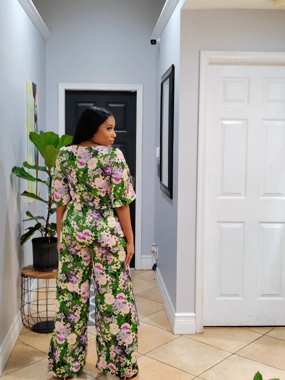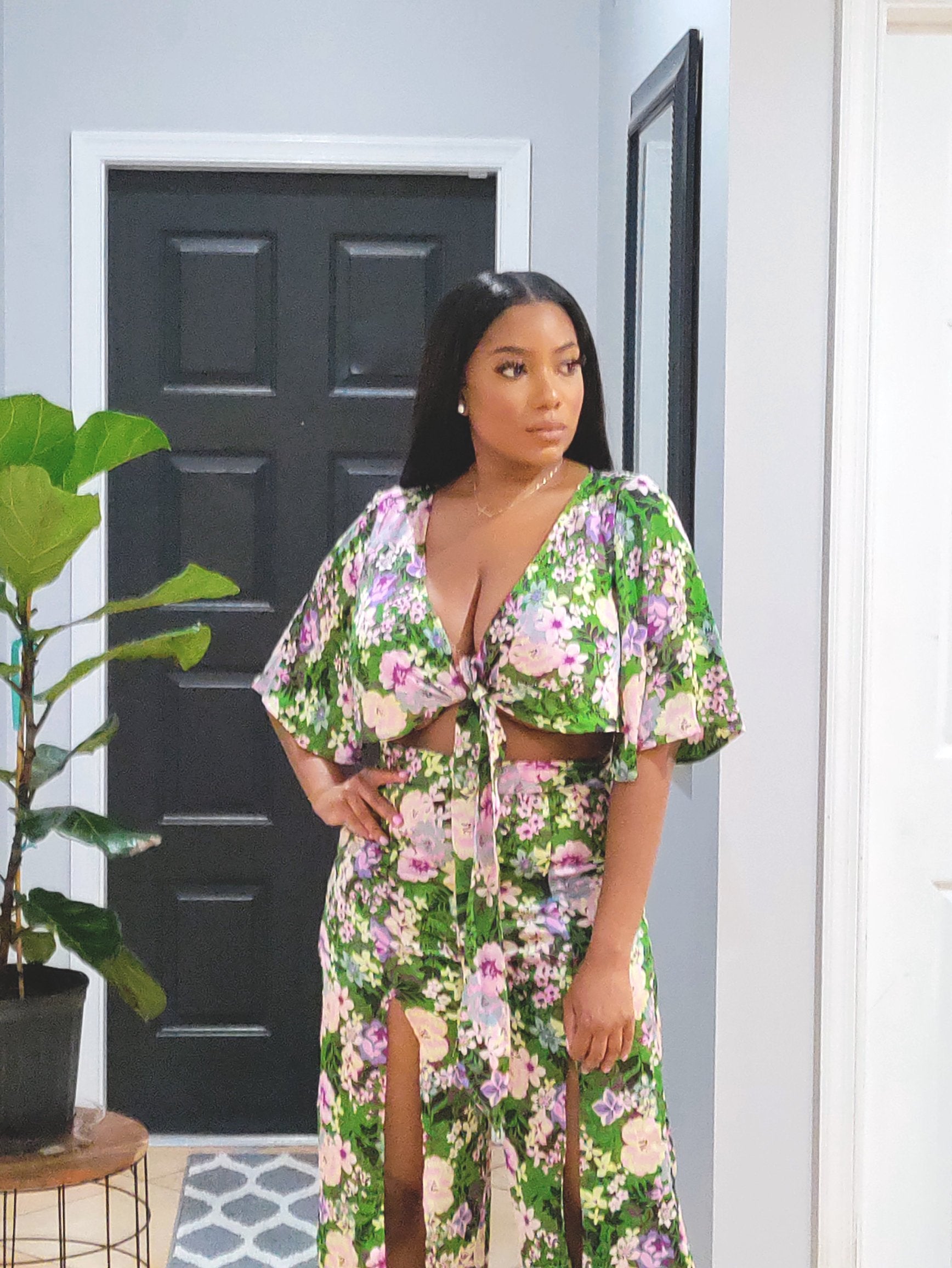 SHEIN floral print two-piece pants set top is a wrap tie up crop, pant legs have front splits. Size small but can fit up to a size 5