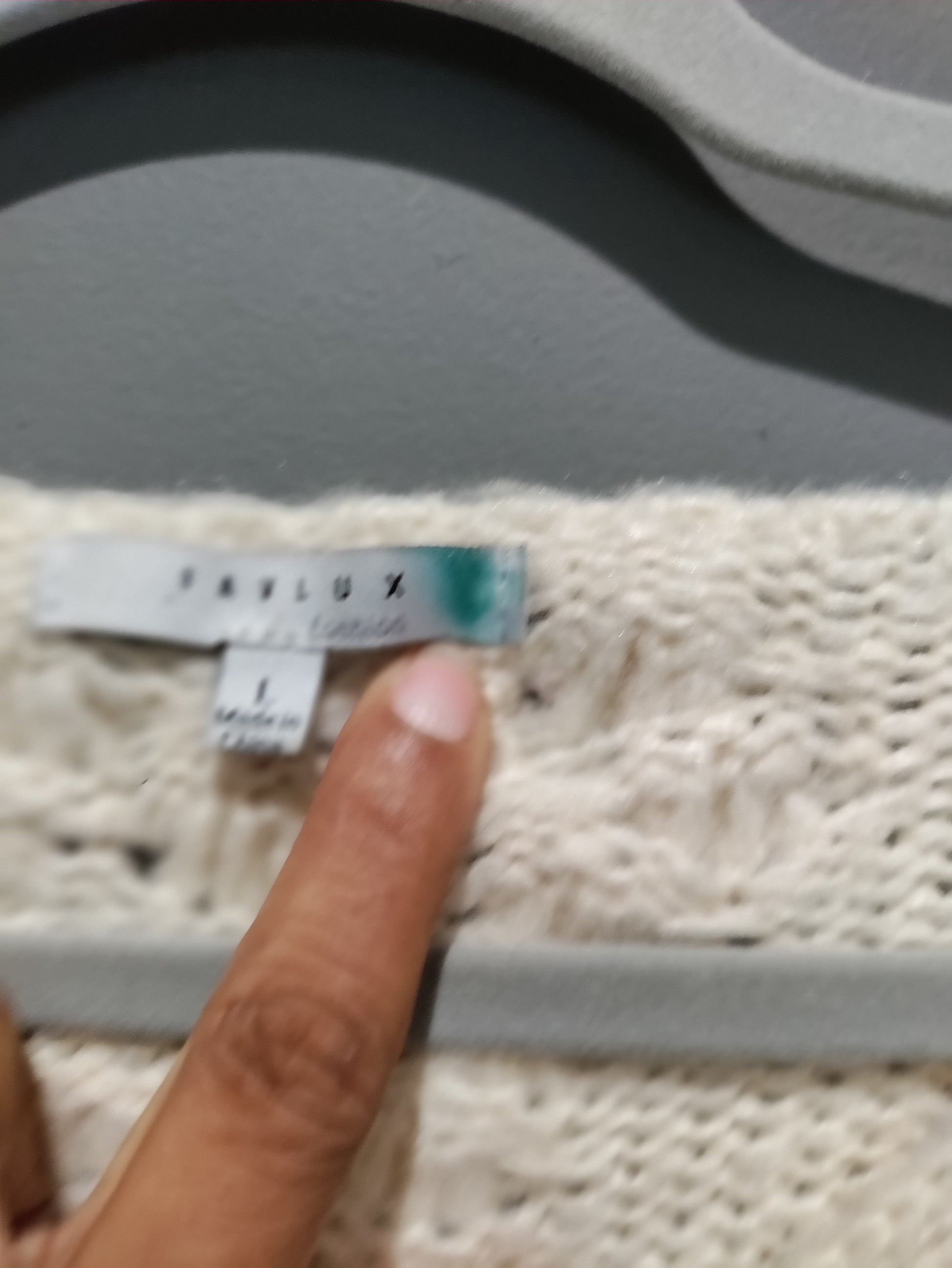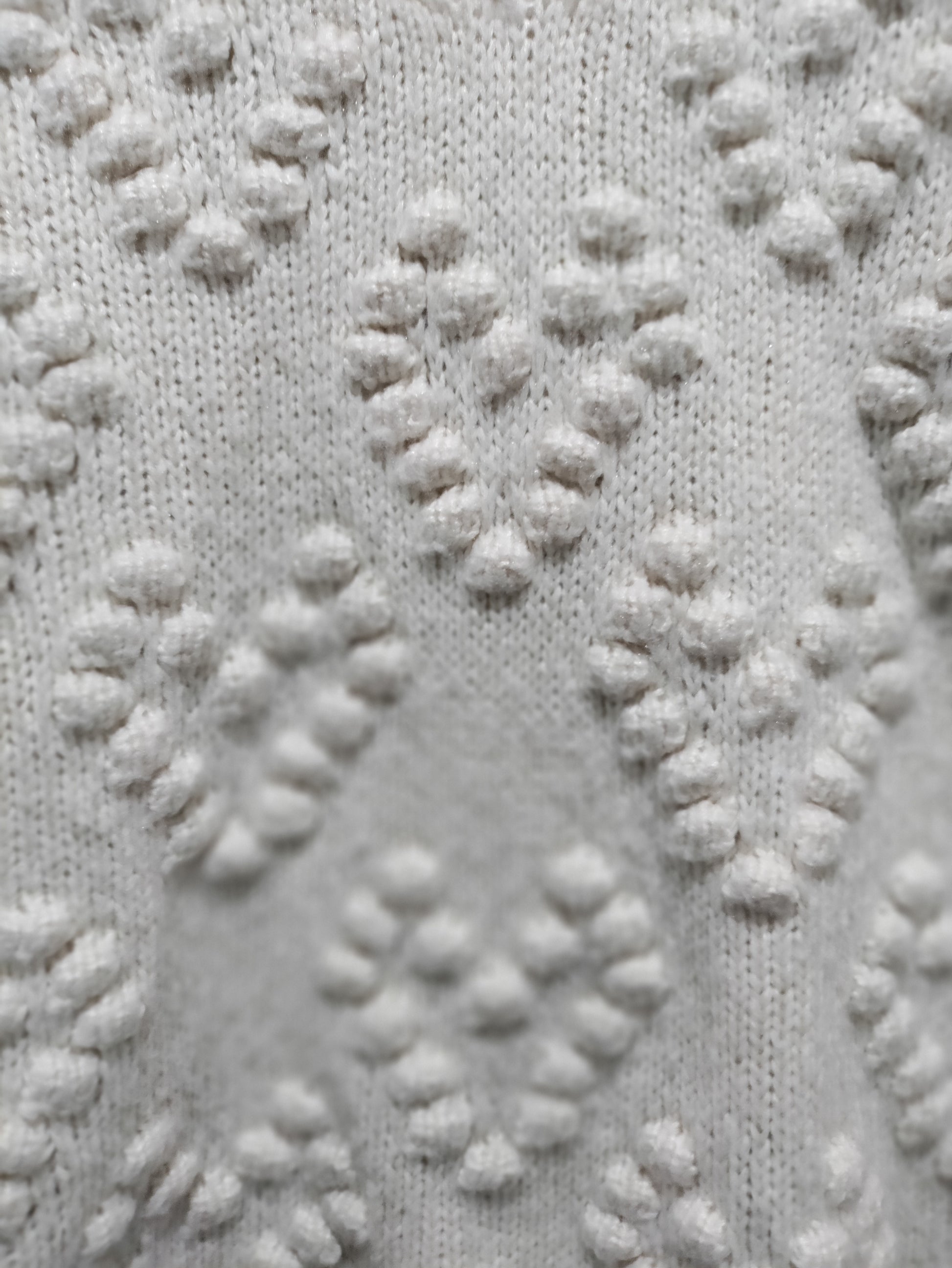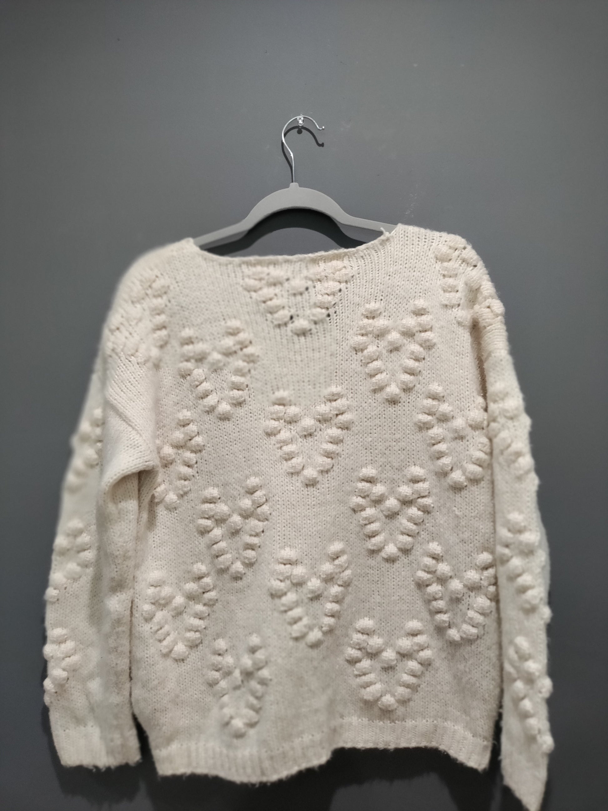Ladies fisherman net long sleeve crew neck sweater with stitched hearts throughout the sweater.