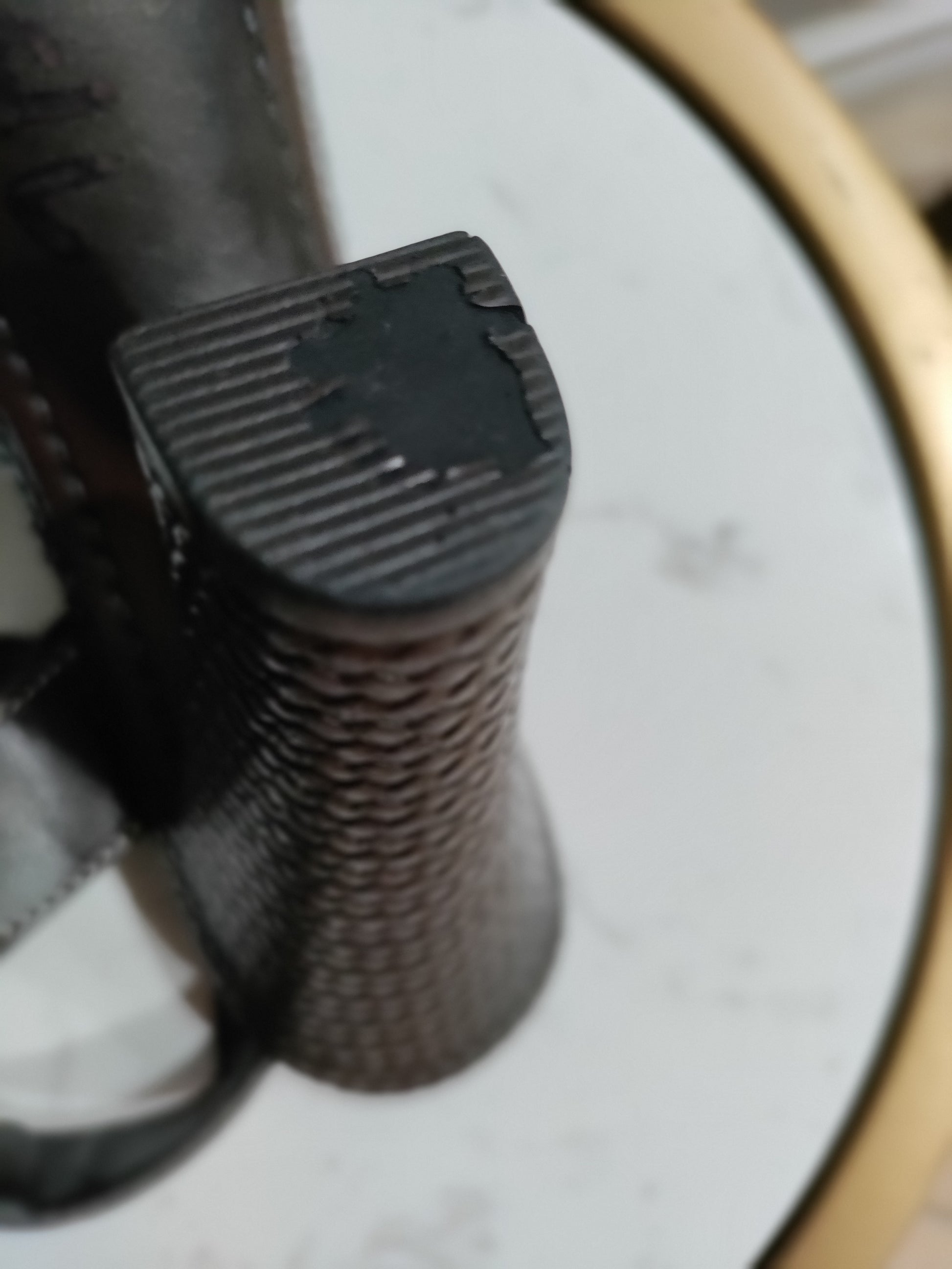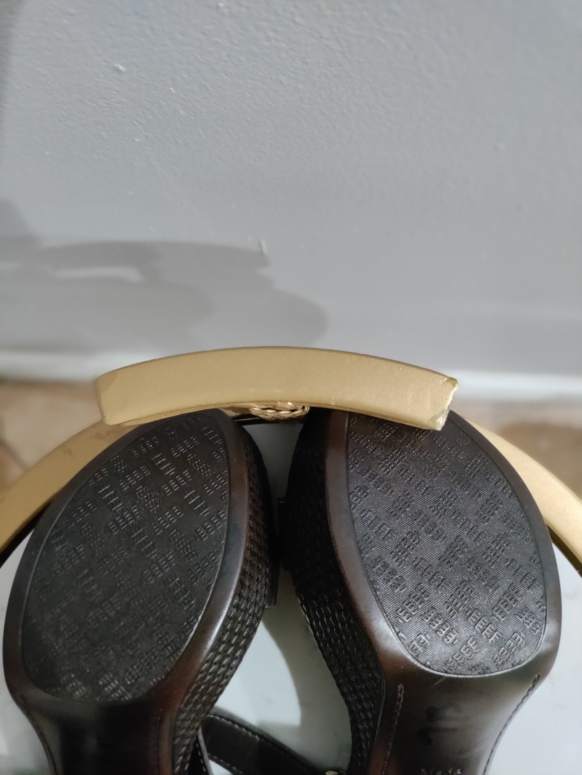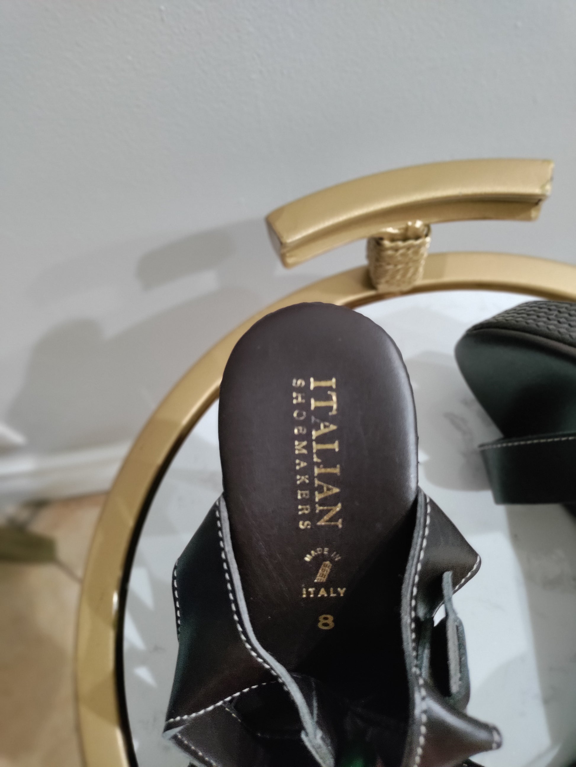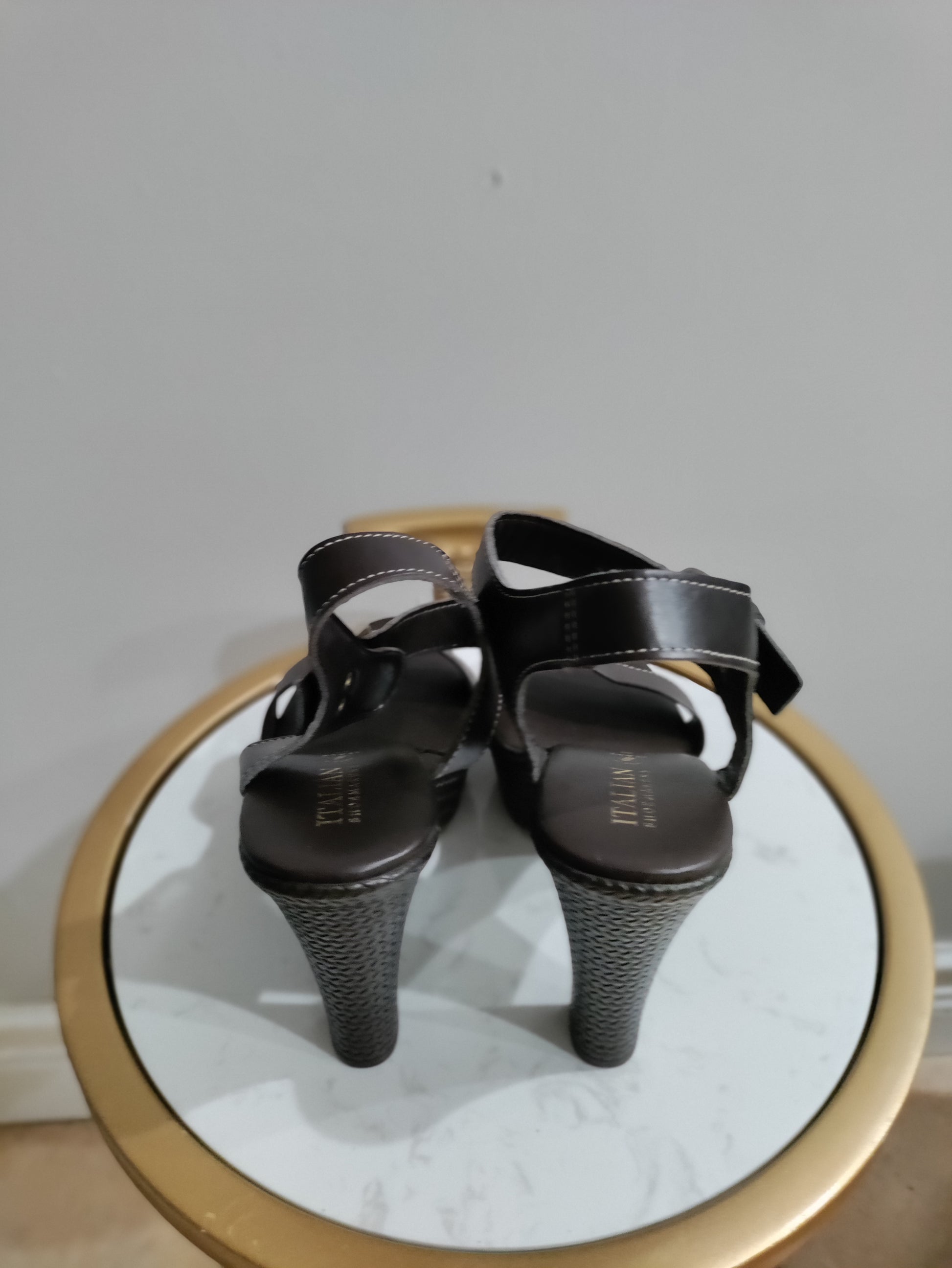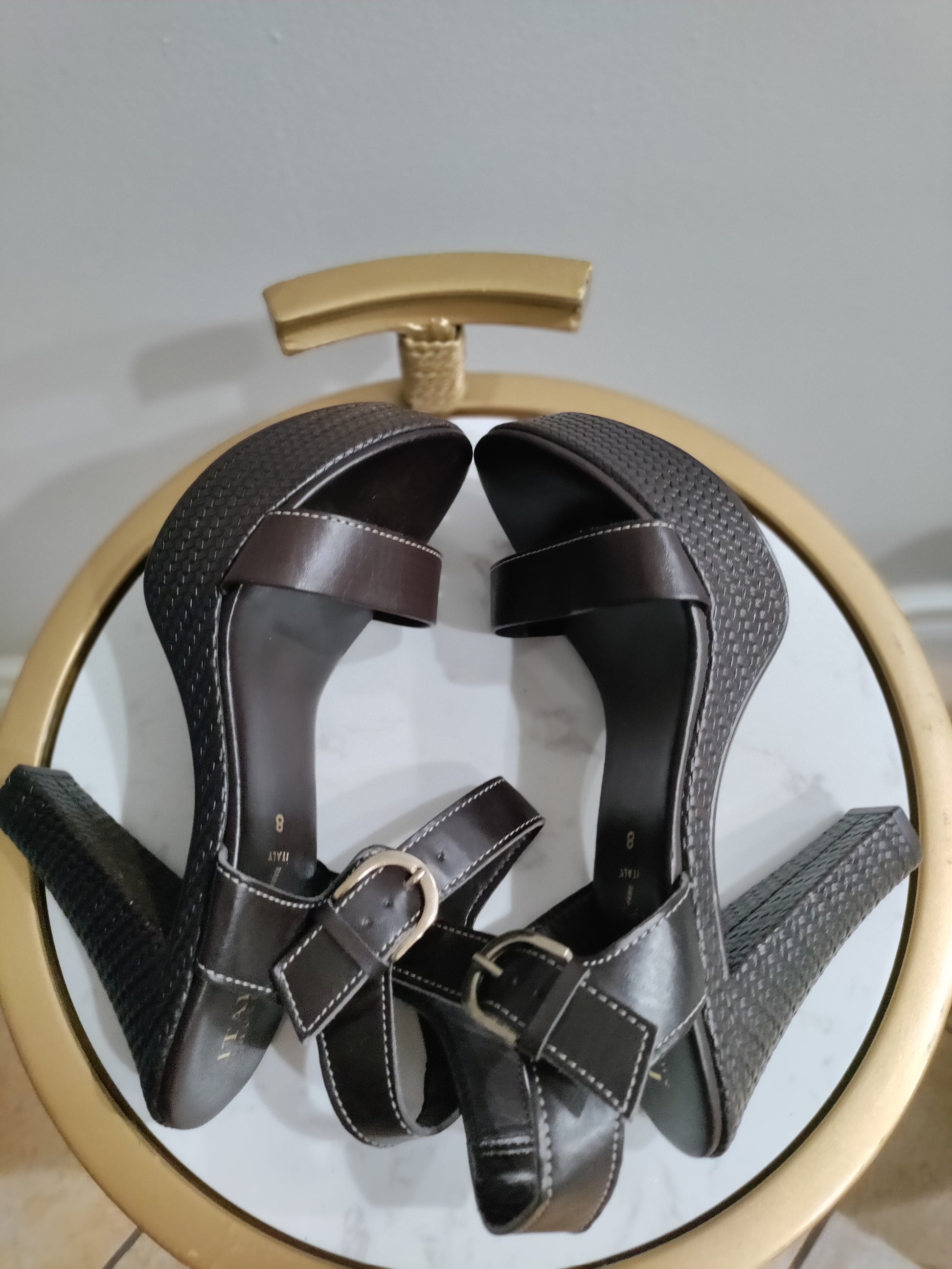 Dark chocolate brown open toe ankle strap medium platform with a chunky heel Italian made shoes size 8 have some peeling on the bottom heel overall shoe is in excellent condition