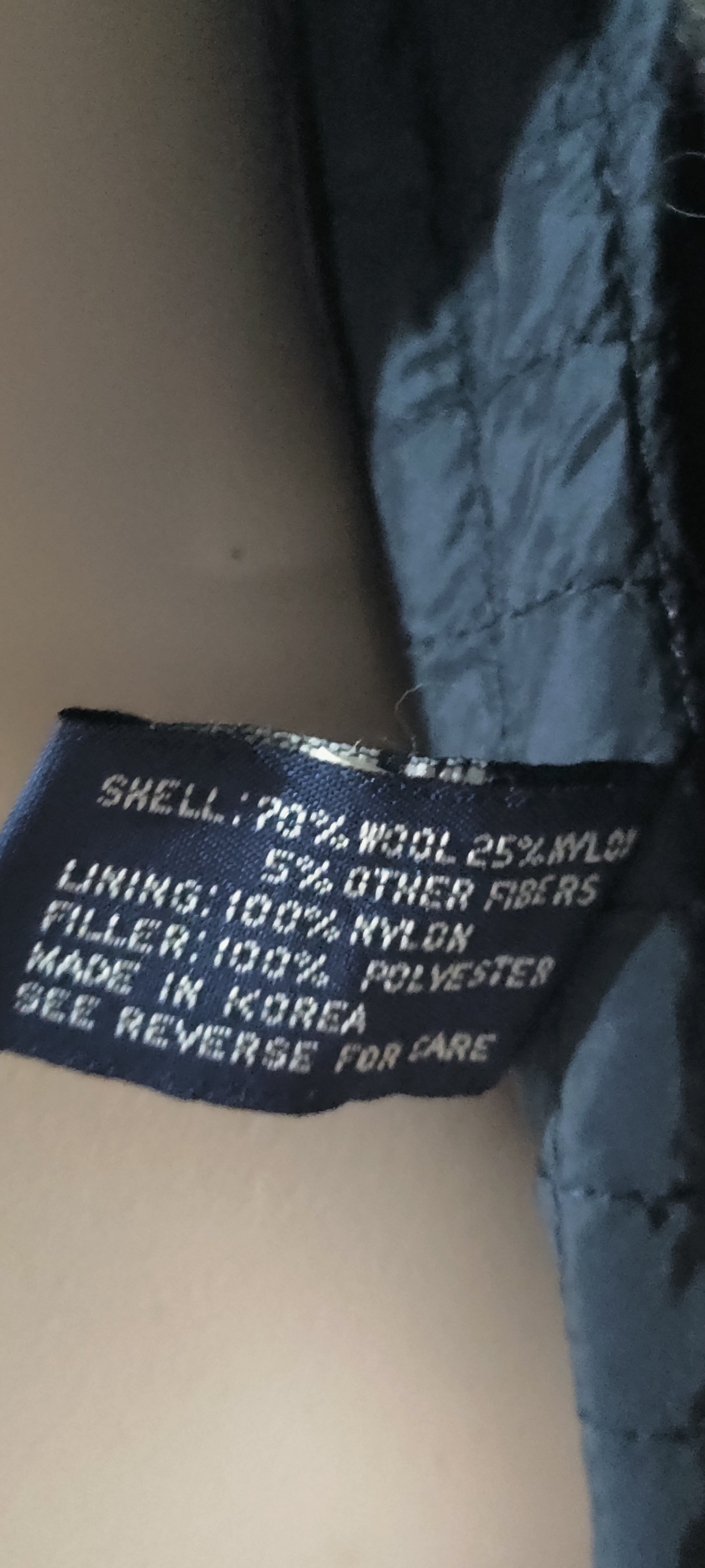 70% wool 25% acrylic 5% other fibers lining is 100% nylon.