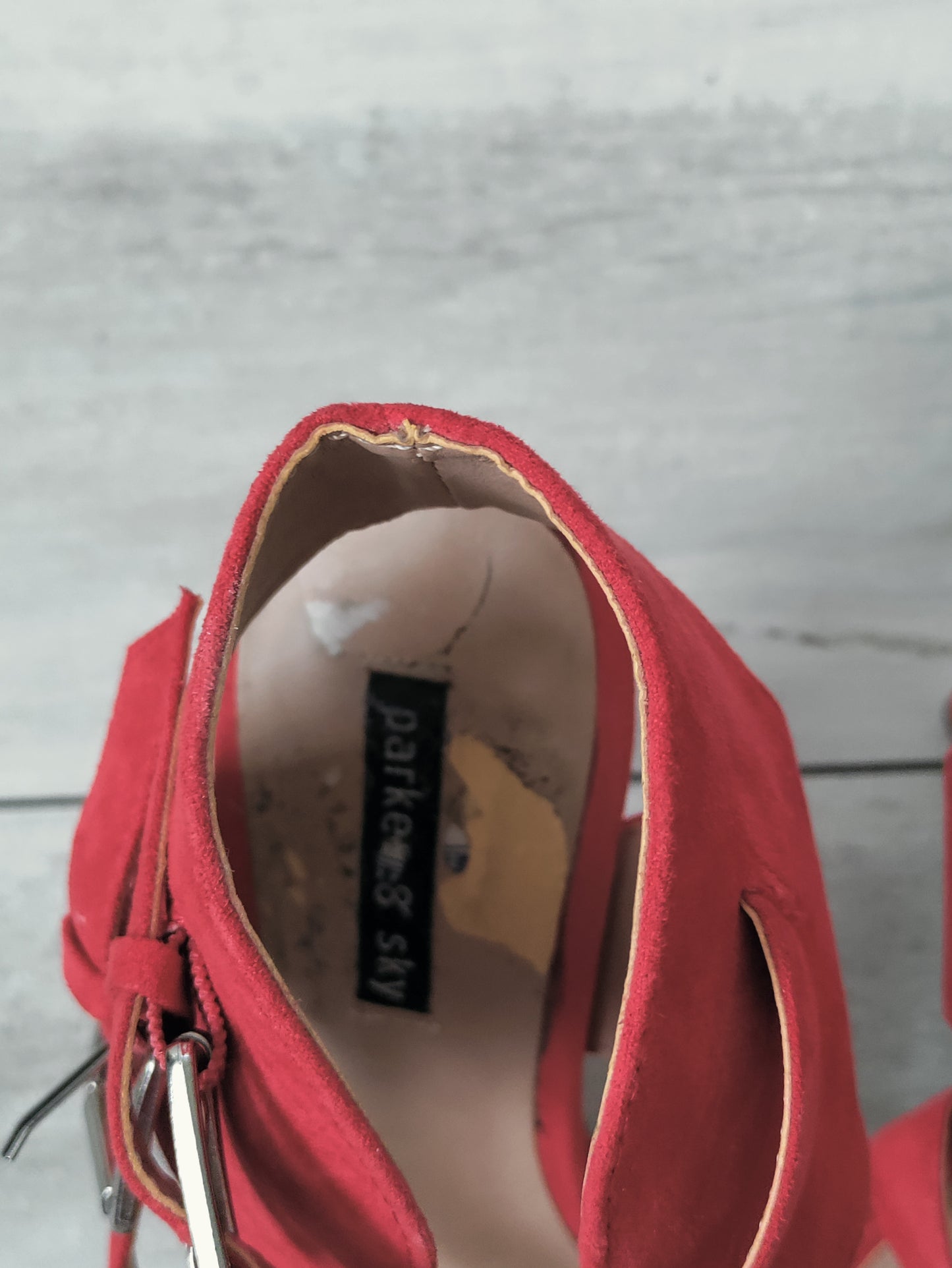 Parker & Sky ankle strap with two buckles on each side, suede inspired finished 4 inch heels. flaws? yes there is some peeling in the right shoe where the price sticker was peeled off. Overall shoes are in great condition.