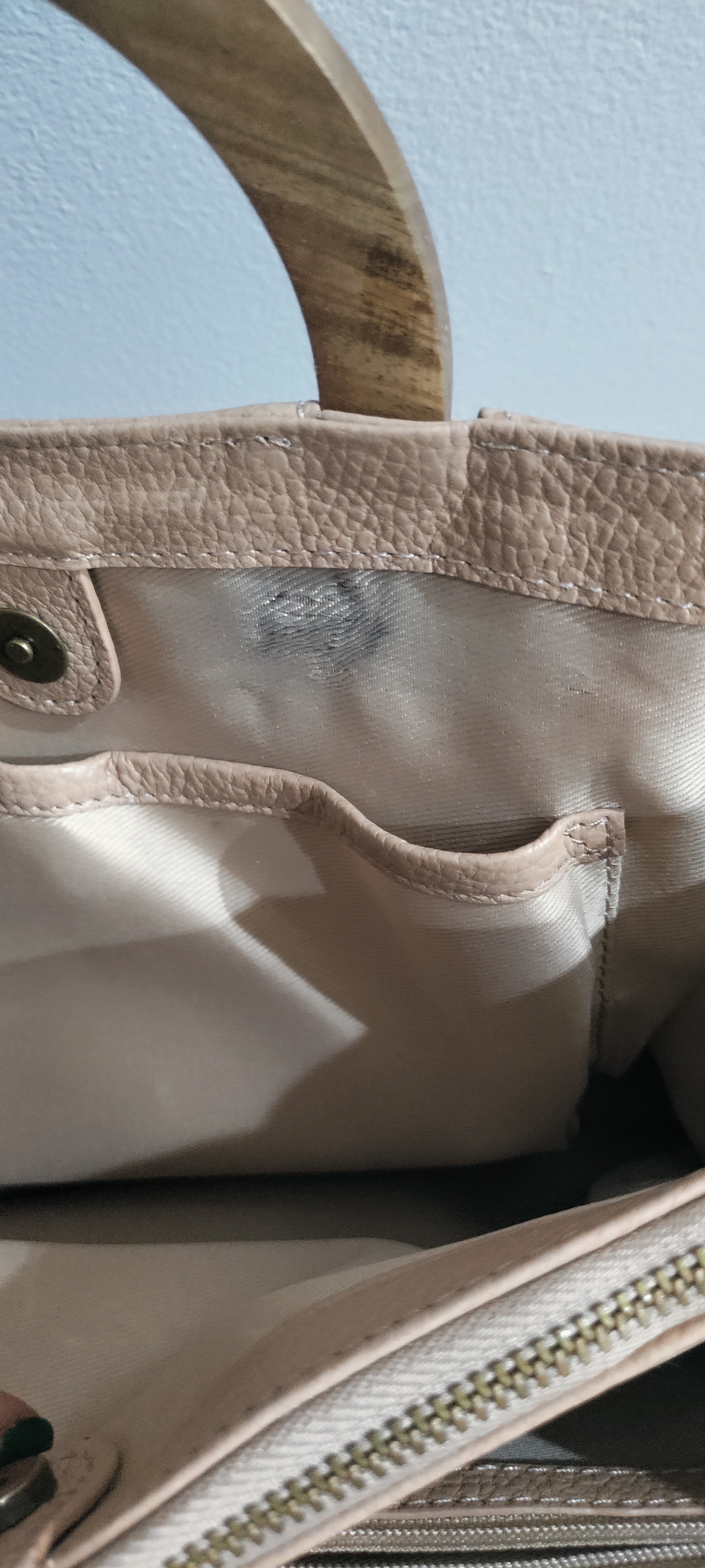 Taupe color handbag with wooden handles and a shoulder strap by Rachel Roy has many compartments inside with magnet snap has a small ink smear inside of bag but not noticeable has gold feet at the bottom of the bag in excellent condition