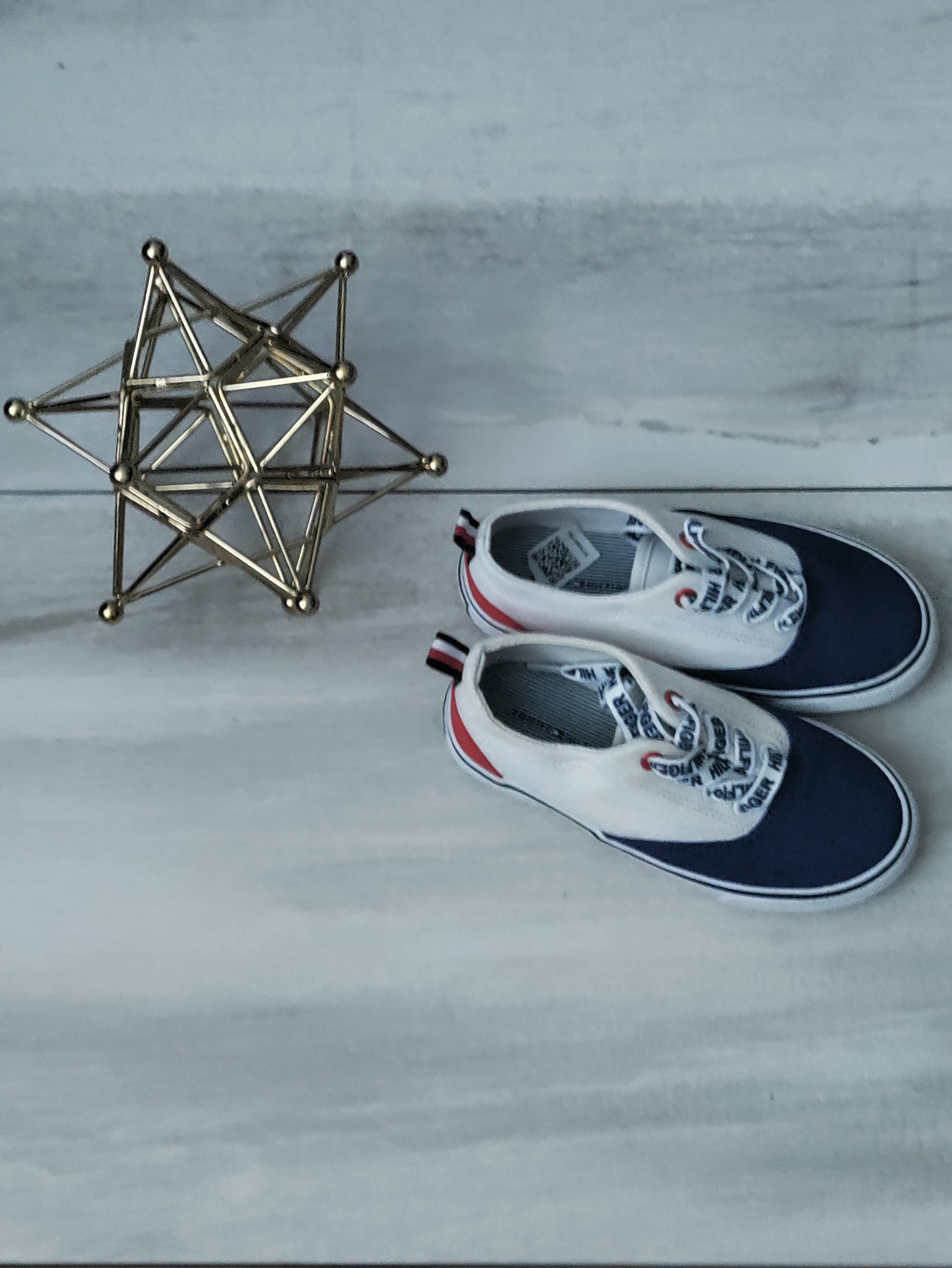 Tommy Hilfiger toddler red white and blue canvas sneakers with shoe strings in excellent condition