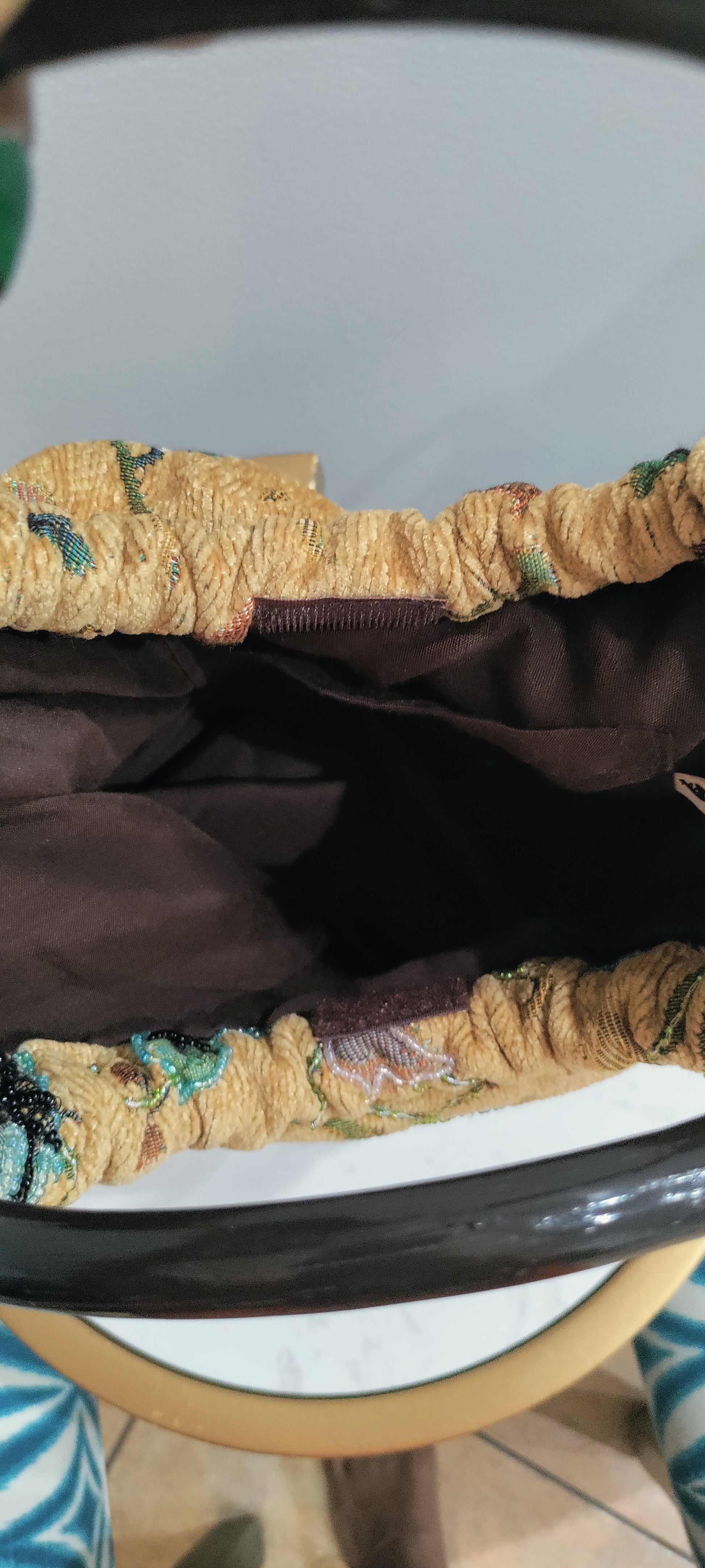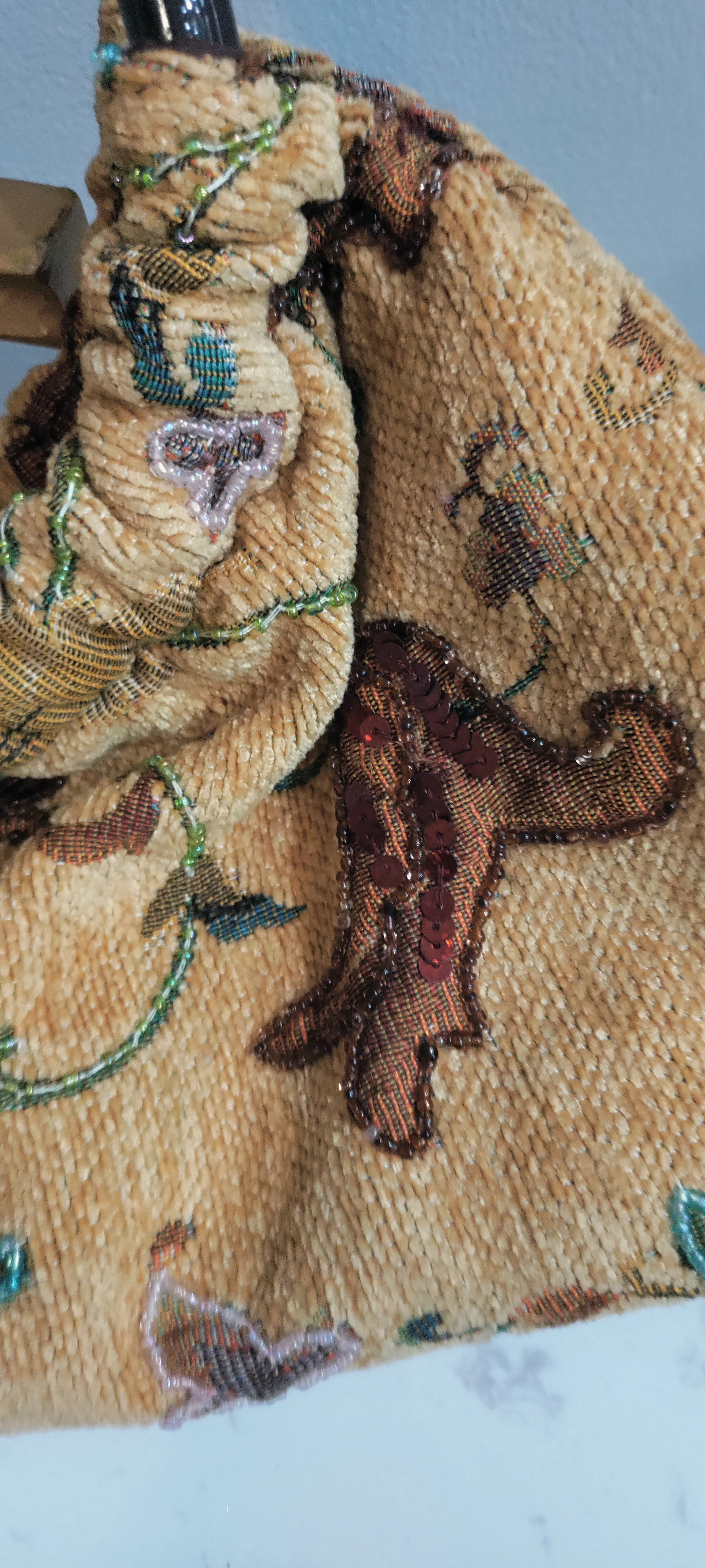 Tan color vintage handbag with wooden handles has beaded and sequins detail throughout the handbag. in excellent condition