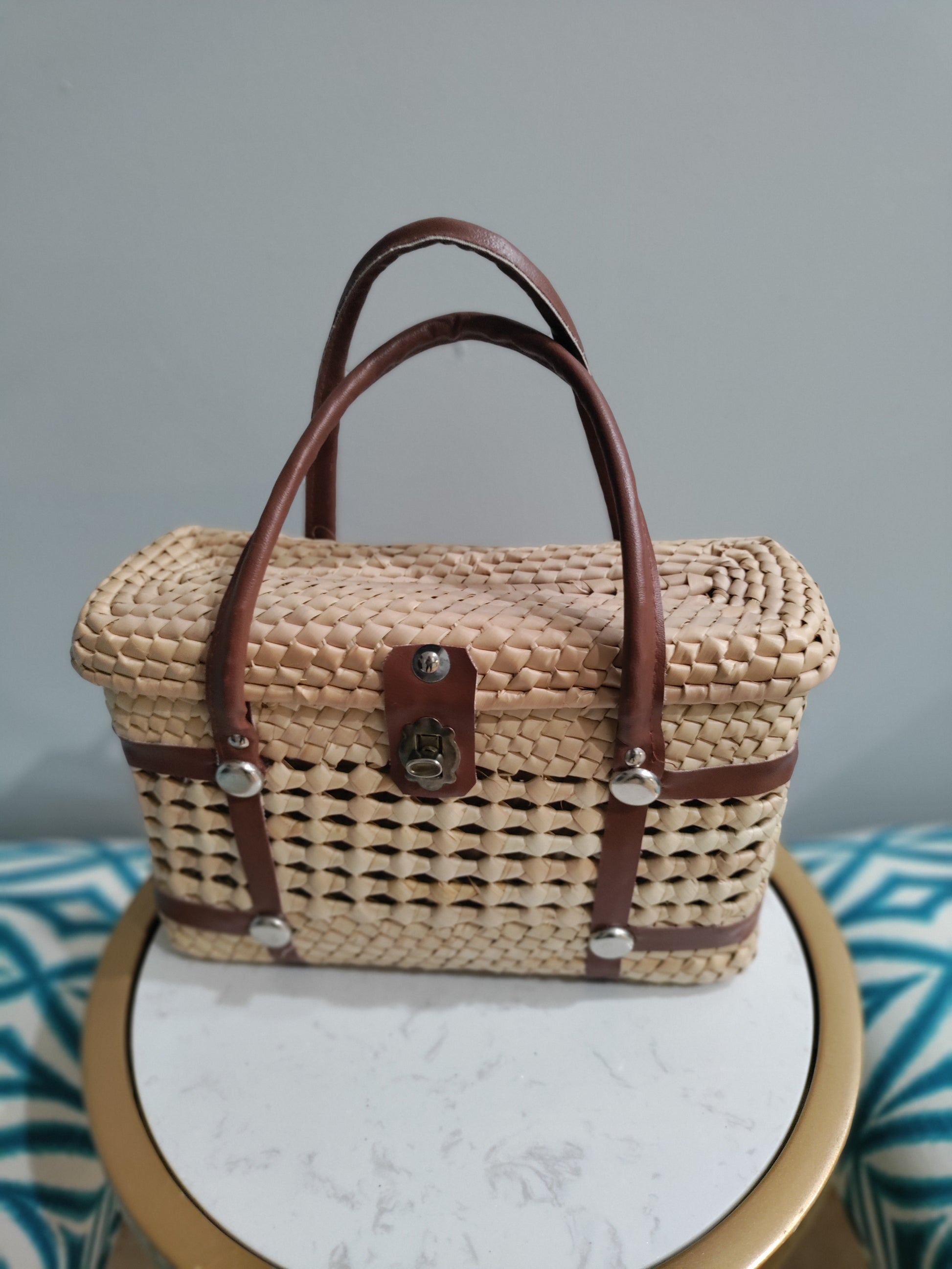 Wicker picnic basket handbag with twist lock and short straps, with silver hardware studs. handbag has silver stud feet on the bottom. In excellent condition.